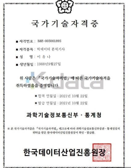 저는 2021년 국가기술자격증을 취득후 빅데이터