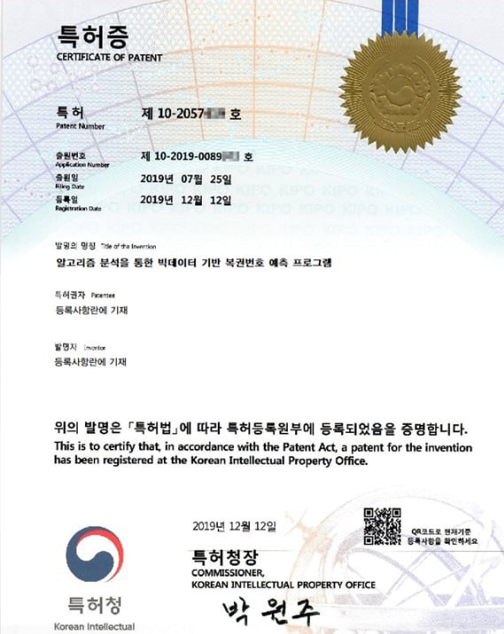 대한민국에서 꼽히는 빅데이터 분석연구원으로서 특허를받은